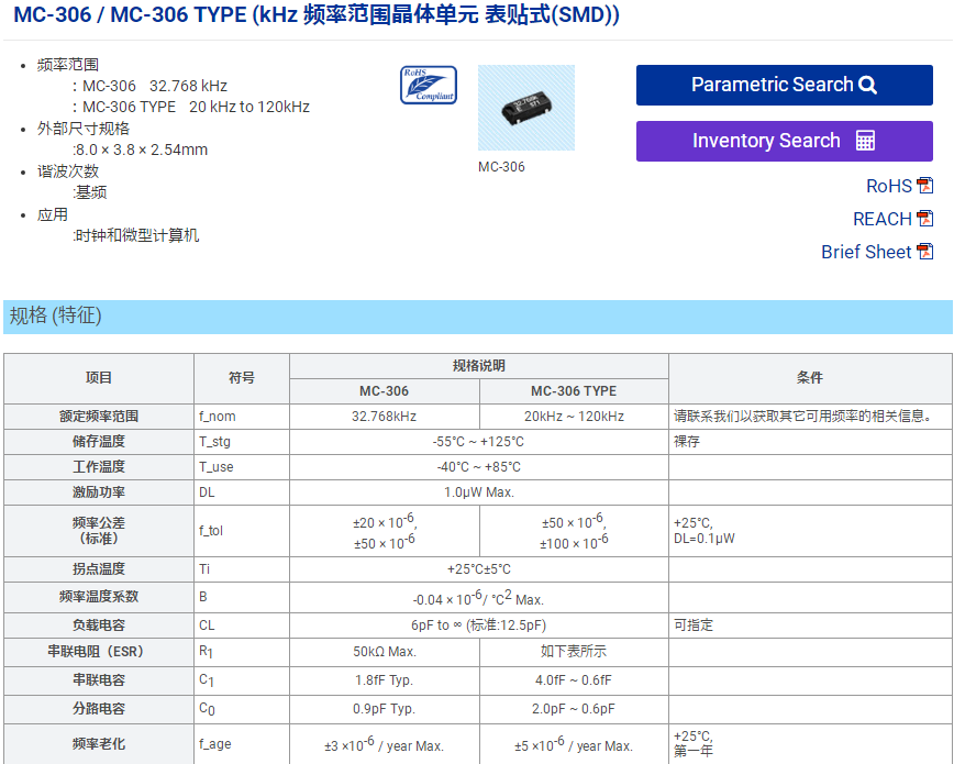 今天來介紹下無源晶振MC-306,晶體諧振器MC-306,屬于愛普生無源晶振,表晶32.768K,MC-306同時也提供20kHz~120kHz范圍內的頻率定制。相較于MC-146,MC-306尺寸略大。在32768hz工作頻率下具有較小的串聯(lián)電阻(20kΩ Max.)。MC-306常用的負載電容有MC-306 6pF,9pF,12.5pF等等。MC-306廣泛應用于小型便攜式通信設備,時鐘和微型計算機如手機、GPS模塊、FM調諧模塊、PHS、PDA、數(shù)碼相機、、Zigbee、血糖值測量儀、信用卡結算機、各種微機的預備 時鐘、無繩電話、移動設備、電表等儀器設備等。下面南山電子給大家詳細的介紹下愛普生MC-306同系列晶振型號: