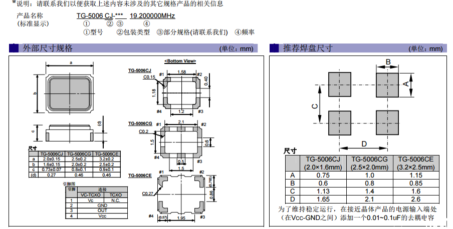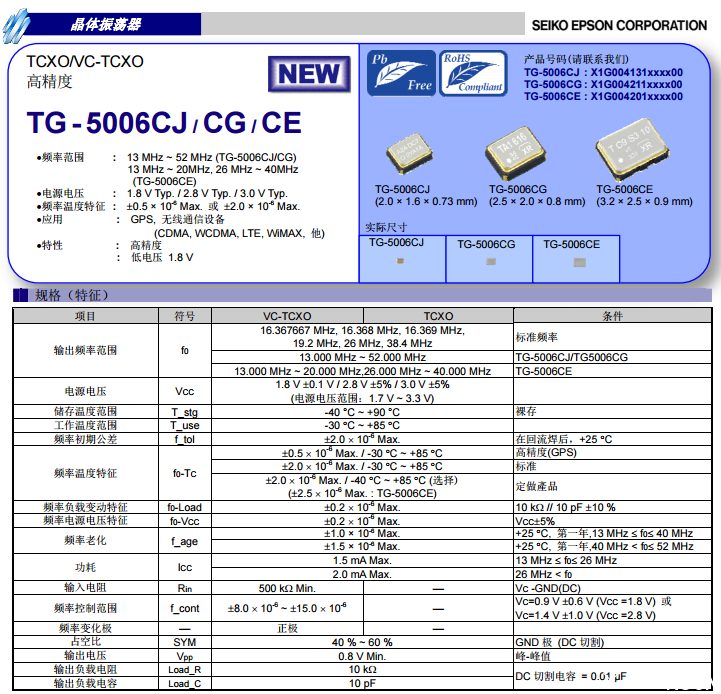 今天給大家介紹TG-5006系列:TG-5006CJ,TG-5006CG,TG-5006CE。精密的時(shí)間是現(xiàn)代通信、導(dǎo)航定位以及計(jì)算機(jī)自動(dòng)控制的關(guān)鍵和核心,目前主流應(yīng)用都是采用TCXO溫補(bǔ)晶振來(lái)提供。高精度晶振廠商愛普生晶振新推出超小型溫補(bǔ)晶振TG-5006系列:TG-5006CJ,TG-5006CG,TG-5006CE。其中每個(gè)型號(hào)都對(duì)應(yīng)3種版本:VC-TCXO、TCXO和TCXO(具待機(jī)功能),可滿足多樣化的用戶需求。低功耗、頻率穩(wěn)定、小型化的優(yōu)點(diǎn)讓其適合應(yīng)用于GPS設(shè)計(jì)、射頻和無(wú)線通信設(shè)備(CDMA、WCDMA、LTE、WiMAX)等有高精度和高可靠性要求的設(shè)備。TG-5006根據(jù)型號(hào)的不同具有不同的輸出頻率范圍,其中TG-5006CJ,TG-5006CG的輸出頻率范圍為13~52MHz,TG-5006CE的輸出頻率范圍為13~20MHz,26~40MHz,多種頻率輸出為用戶的設(shè)計(jì)提供了更加靈活的選擇,那么TG-5006CJ,TG-5006CG,TG-5006CE三種型號(hào)該如何識(shí)別,三個(gè)型號(hào)規(guī)格參數(shù)又有什么區(qū)別呢?南山電子幫你具體來(lái)分析下,首先我們來(lái)看規(guī)格書: