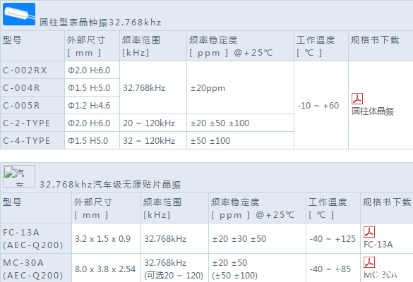 我們?cè)陔娮邮袌?chǎng)里,常聽到的晶振頻率就是32.768KHz,其實(shí)32.768K貼片晶振在日常生活中確實(shí)不可或缺。主要是因?yàn)?strong>32.768K貼片晶振比較容易分頻以便于產(chǎn)生1秒的時(shí)鐘頻率,因?yàn)?2768等于2的15次方。我們每天用的手機(jī),手表,電腦上顯示作用的鐘就是由它演變過來的。32.768K貼片晶振晶體主要被使用在各種時(shí)間顯示的計(jì)時(shí)電路中,因此也常常被稱為表晶或者鐘振。其中無源的晶體諧振器因其相對(duì)低廉的價(jià)格,使用較為廣泛,因?yàn)槠淝懈罘绞?,也被稱為音叉晶振。愛普生的表晶鐘振在市場(chǎng)具有重要市場(chǎng)地位,愛普生晶振32.768K貼片晶振,MHZ以及GHZ上都有重大突破,并且以32.768K貼片晶振享譽(yù)晶振行業(yè)32.768K的神奇在于它對(duì)時(shí)鐘的控制性能,精密度越高的表晶對(duì)時(shí)間控制的越精準(zhǔn),32.768K晶體分為貼片式和直插式,不同的電子產(chǎn)品使用的晶體也不一樣,直插式我們常見的就是2X6和3X8系列的,32.768K貼片晶振就有很多種了,貼片系列的性能要比直插式的好很多,作為愛普生晶振官方授權(quán)中國(guó)區(qū)核心代理商,南山電子為大家精心整理了32.768K貼片晶振全系列規(guī)格和型號(hào)表,如下圖所示: